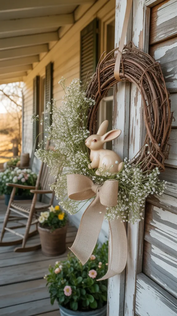 Add a small wooden or fabric bunny to your baby’s breath wreath for extra Easter charm. Place the bunny slightly off-center and surround it with clusters of baby’s breath and soft greenery. A burlap or linen bow completes the farmhouse look.