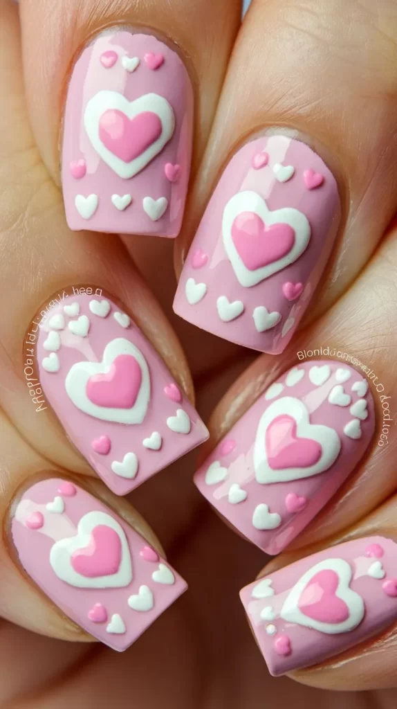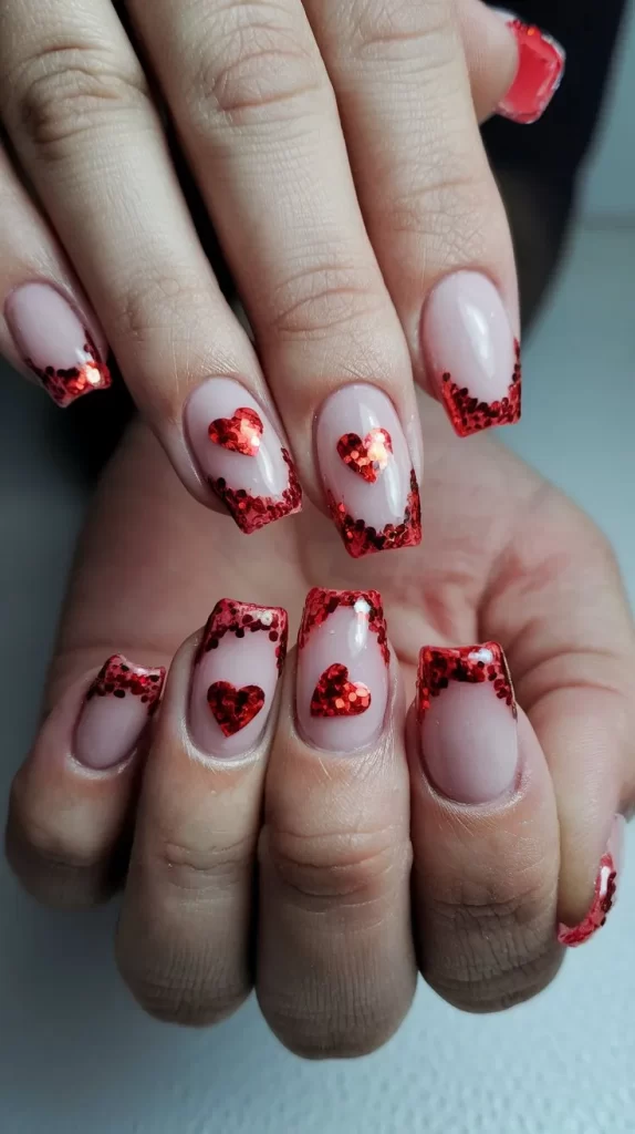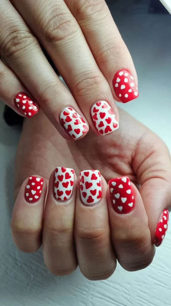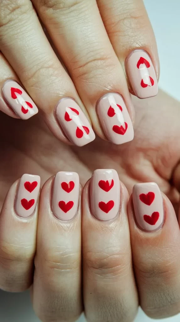 You can’t go wrong with the timeless classic—red hearts on a pink or nude base. It’s romantic, simple, and always in style.