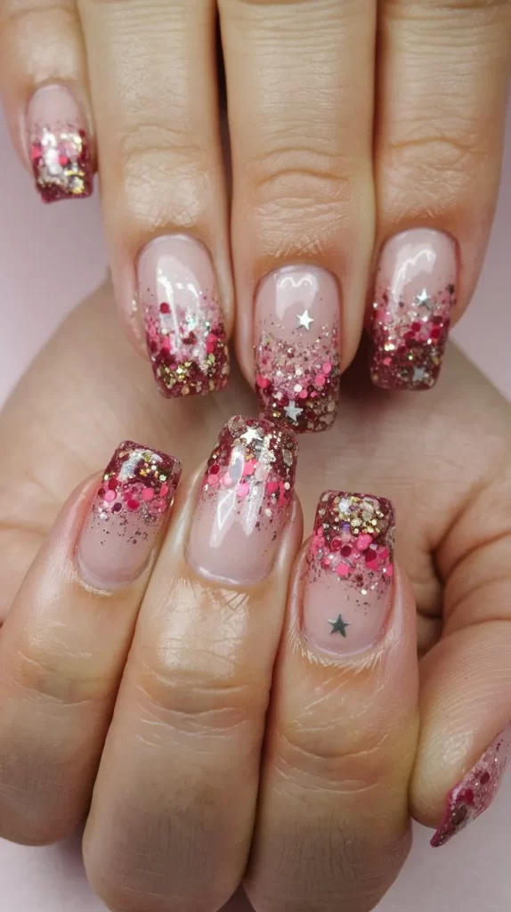 Glitter gradient tips offer a chic, sparkling effect for a romantic look that’s easy to create at home.