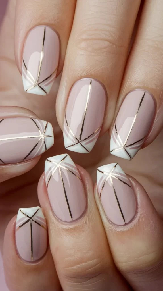 - Use gold nail tape or a gold nail art pen to create thin lines or geometric shapes across your nails.