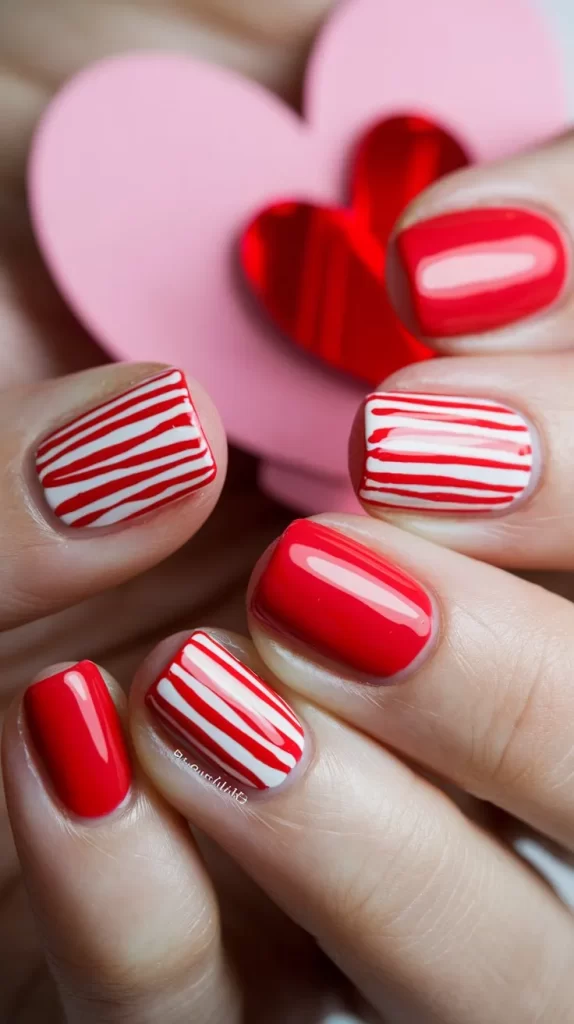 A fun and easy way to add a bold look to your nails is with red and white striped accents, perfect for Valentine’s Day.