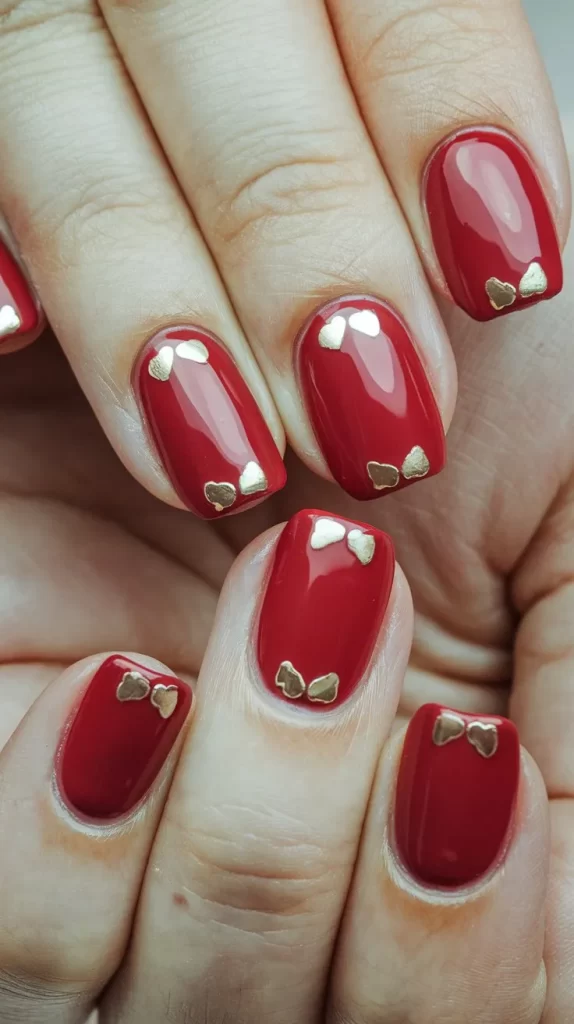 A simple red base with tiny gold heart accents gives your nails an elegant and romantic touch for Valentine’s Day.