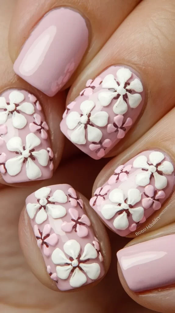 - Once dry, use a small dotting tool to create flower petals using white or darker pink polish.