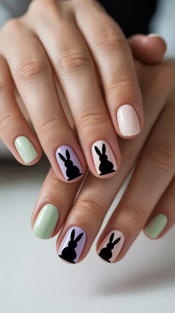 Instead of detailed faces, this idea uses simple bunny silhouettes. Paint your nails in pastel or nude shades, then add black or white bunny shapes on one or two nails. The silhouettes give a modern, artistic feel.