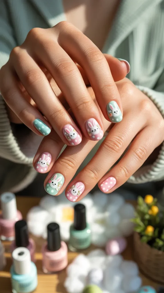 This style is also a smart purchase for anyone who already owns pastel polishes. You can create multiple looks with the same colors, making it a cost-effective beauty choice. The bunny face can be simple—just ears, dots for eyes, and a tiny nose—yet still looks charming and seasonal.