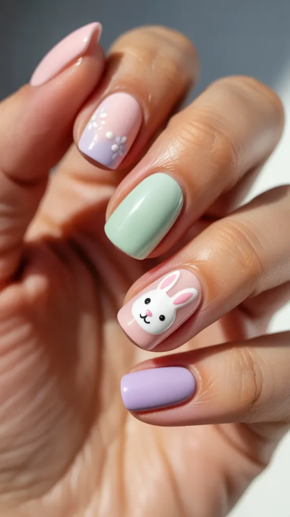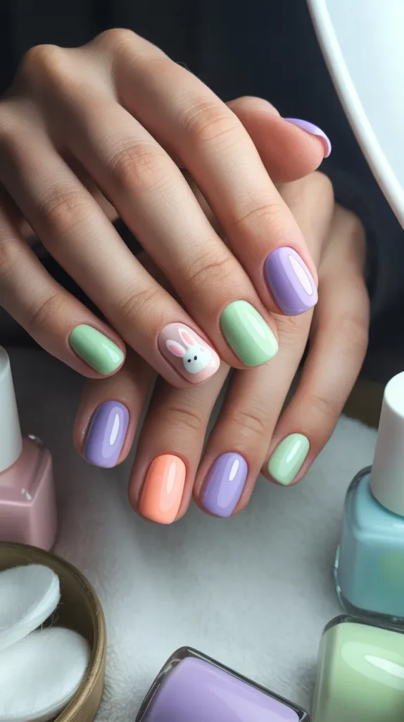 Short nails can still look amazing with bunny art. Try colorful tips in pastel shades and place a small bunny on one nail. This design keeps things simple while adding just enough fun for spring.