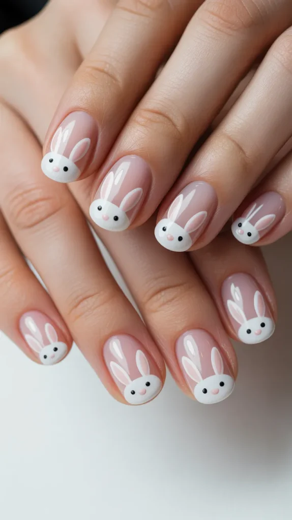 This twist on classic French tips adds bunny faces right at the tip of each nail. Start with a clear or nude base, then paint white tips shaped like bunny ears. Add tiny eyes and noses to complete the look. It’s playful but still neat and polished.