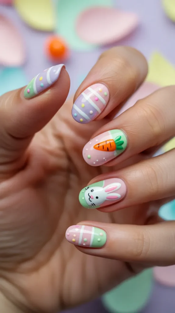 This design mixes bunny art with colorful Easter egg patterns. Paint some nails with stripes or dots like Easter eggs, then add a bunny on an accent nail. It’s bright, cheerful, and perfect for seasonal celebrations.