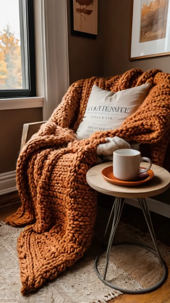• Choose oversized knit blankets in rust, burgundy, or cream.