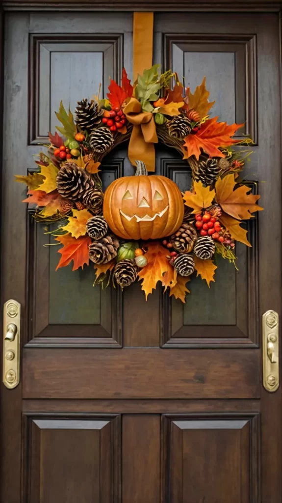 Greet guests with a warm welcome using a handmade wreath filled with faux maple leaves, pinecones, and mini pumpkins.
