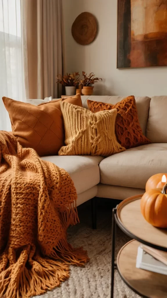Decorative pillows in warm shades of burnt orange, mustard, and rust instantly add cozy charm to your couch or bed.