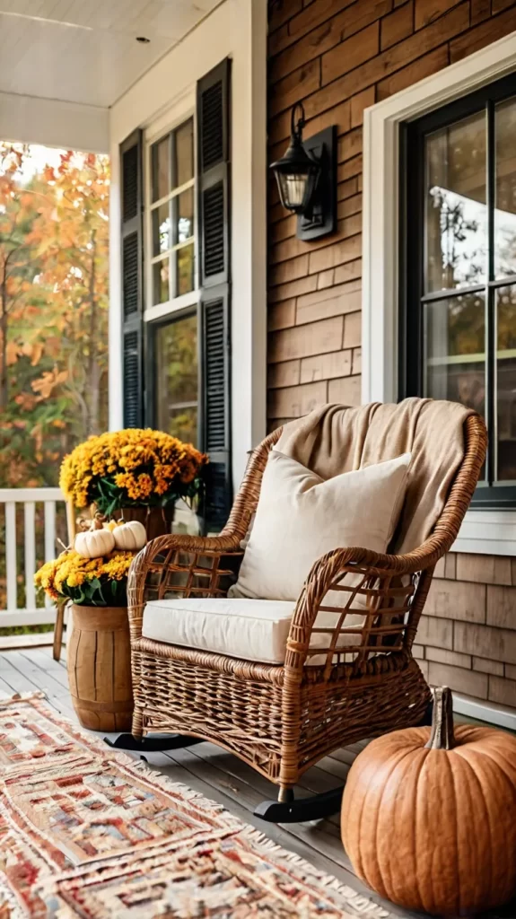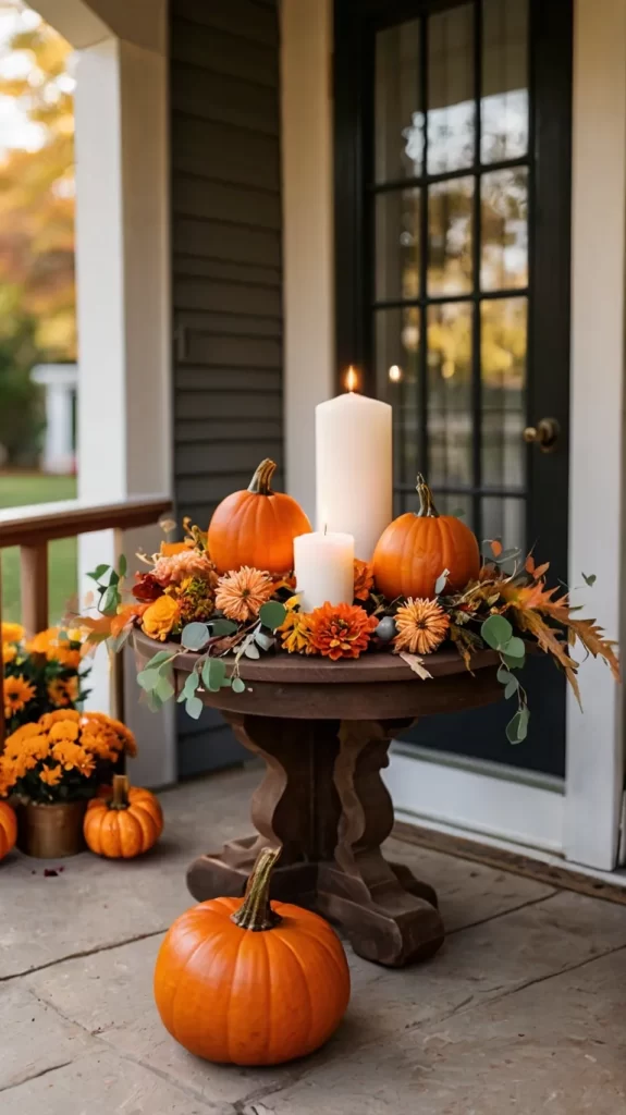 Add small decorative accents like mini pumpkins, candles, and floral arrangements to porch tables.