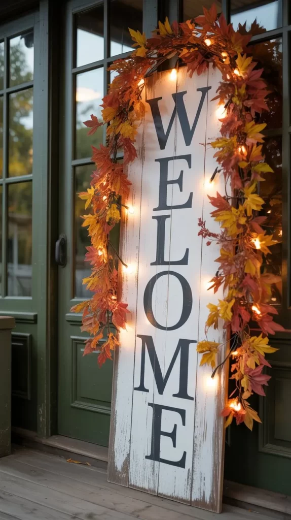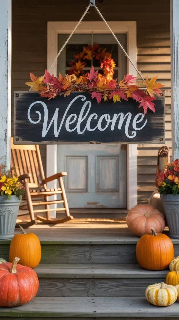 - Find or make wooden signs with phrases like “Welcome,” “Home Sweet Home,” or “Hello Fall.”