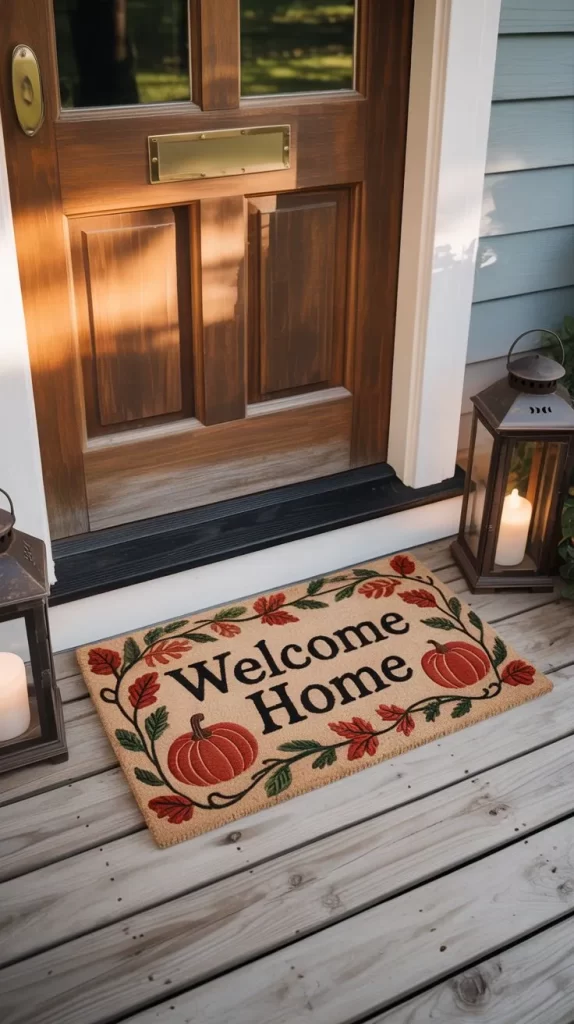A festive doormat welcomes guests and adds a pop of fall spirit.