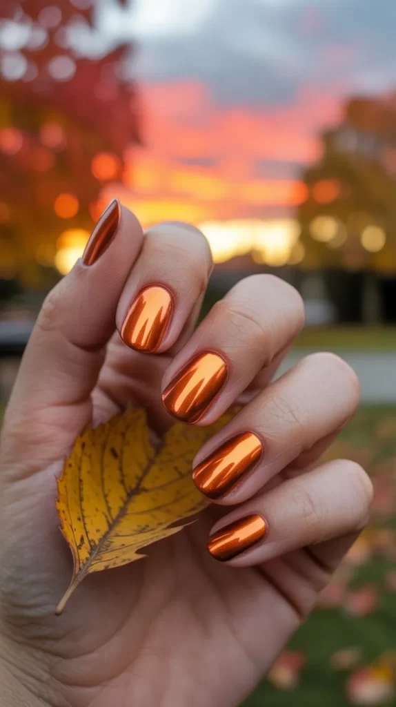 Shiny, metallic copper nails are a bold fall statement that reflect the season’s natural glow.