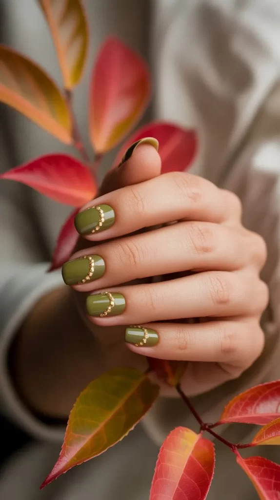 Olive green nails paired with tiny gold studs bring an earthy yet glam vibe to your fall look.