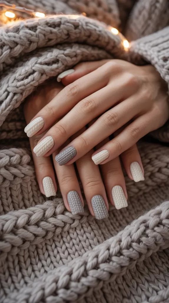 These cozy nails mimic the texture of a knit sweater using 3D gel techniques.