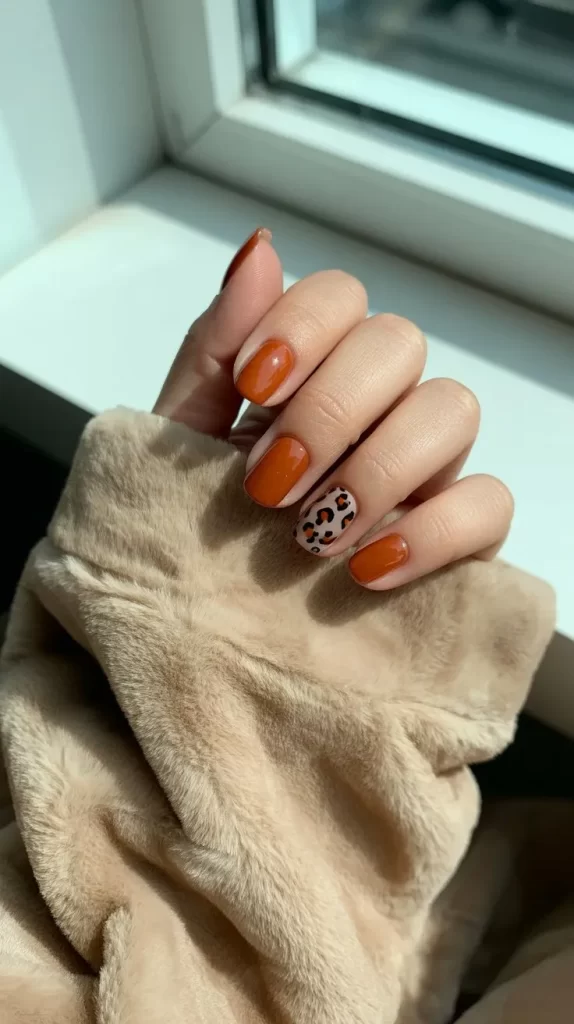 Combine trendy burnt orange polish with a few accent nails in leopard print.