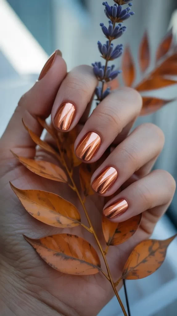 Sleek and metallic, copper chrome nails catch the autumn sunlight with mirror shine.