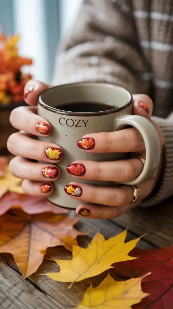 - Add tiny leaf designs in shades of red, orange, and yellow using nail art brushes or decals.