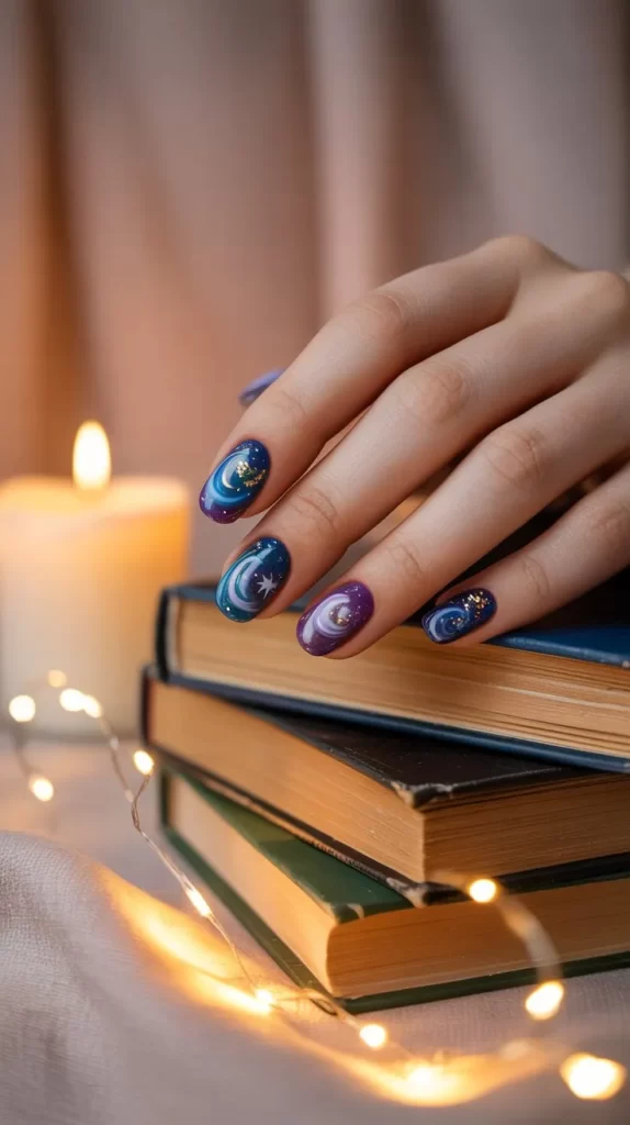 Dark blue or navy nails with tiny stars and moons for a magical fall night look.