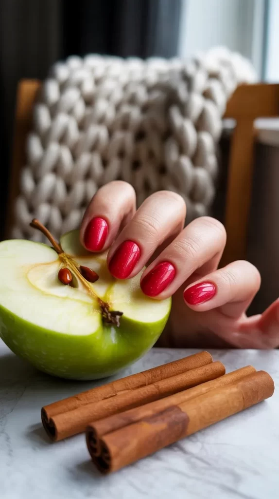 Vibrant red with a touch of shimmer evokes apple cider and fall vibes.
