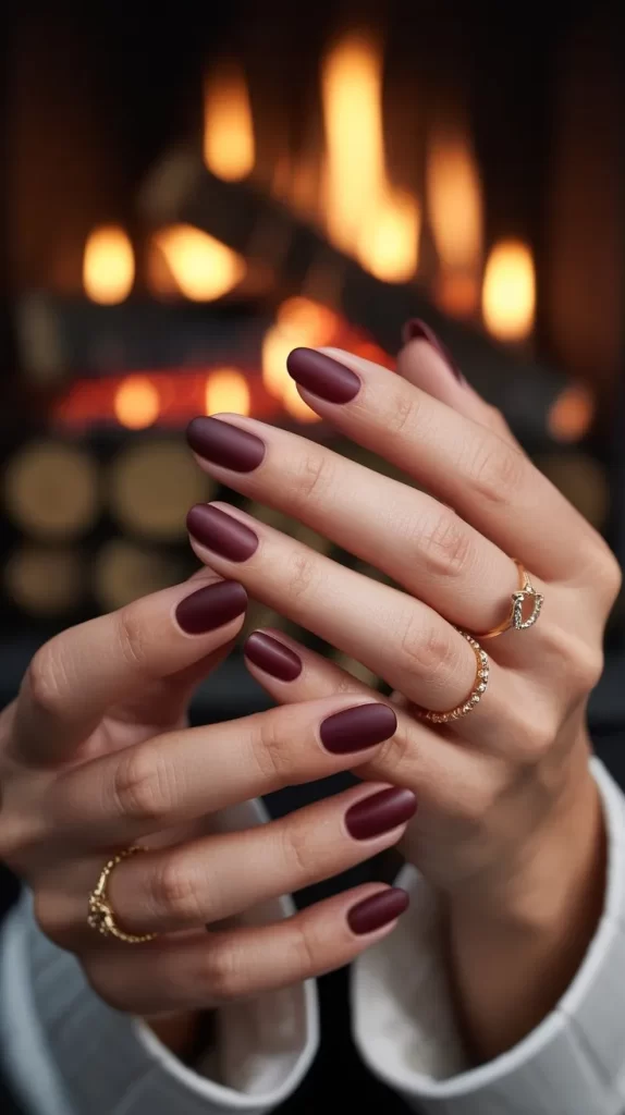 A fall classic, burgundy nails go matte for a velvety, elegant finish.