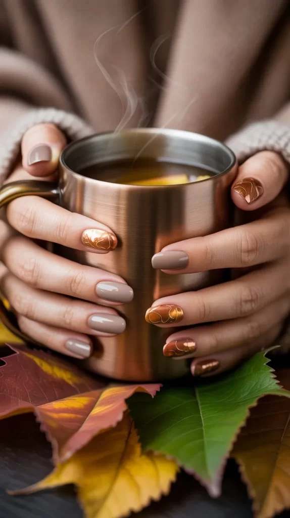 Earthy taupe paired with shiny copper foil gives off major fall sophistication.