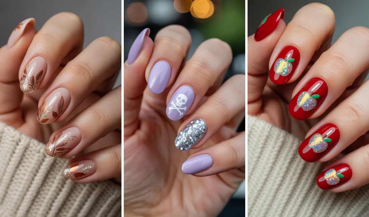 Use nude or soft peach as a base and paint small autumn leaves with gold or copper glitter. The leaves can be hand-drawn or applied as decals. Sprinkle fine holographic glitter for a sparkling effect. This nail design is subtle, girly, and perfect for Halloween and fall celebrations.