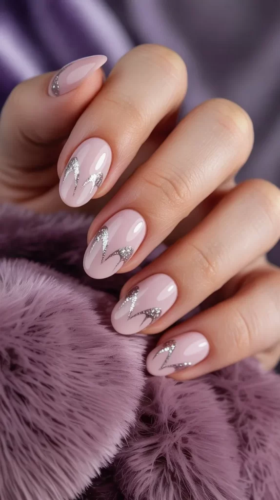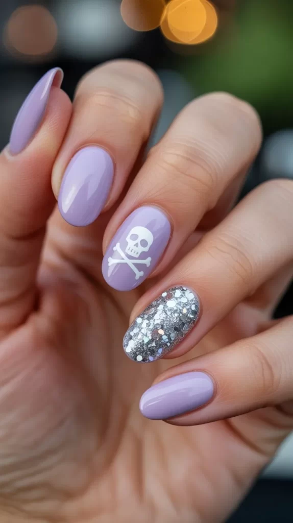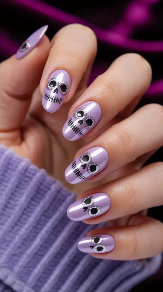Instead of traditional skulls, this design uses lavender as a base color with silver glitter detailing for a girly charm. Paint one or two accent nails with tiny sparkling skulls outlined in silver or white. The glitter adds a soft, magical touch that transforms a spooky motif into a chic statement.