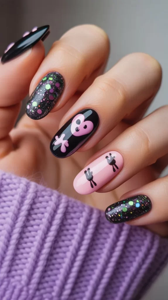 Combine black and baby pink for a bold yet girly Halloween look. Paint alternating nails in black and pink, and add chunky pink glitter or confetti over black nails for contrast. Add tiny candy decals or rhinestones to accent nails for an extra festive touch.