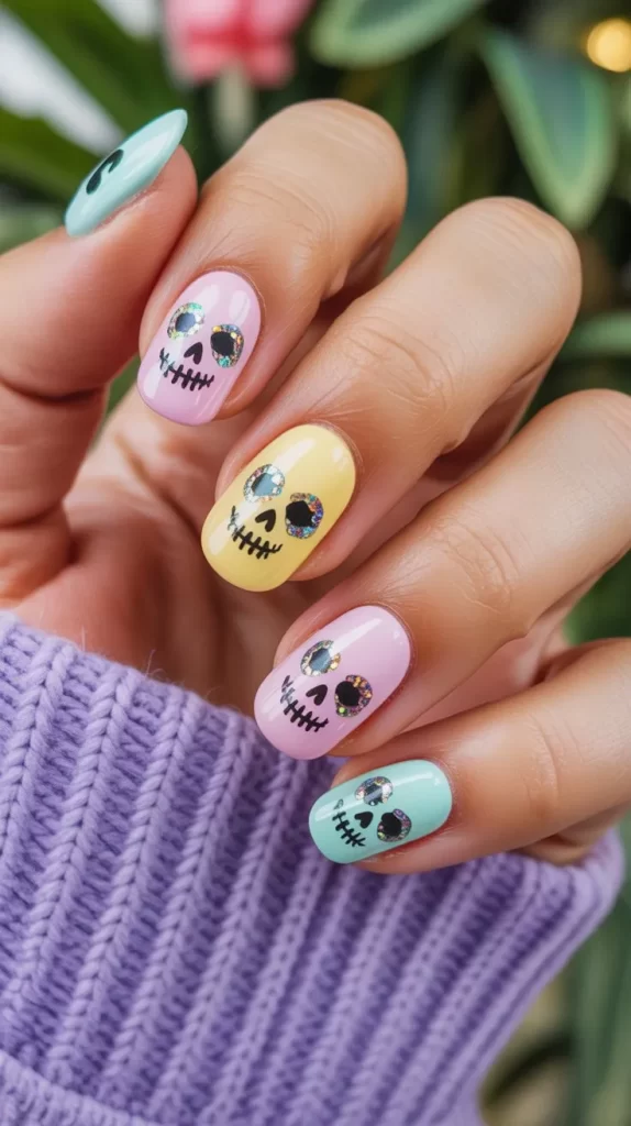 Combine skull shapes with candy colors like soft pink, pastel blue, or lavender. Paint small skulls with glitter or rhinestone accents on one or two nails. Add chunky holographic glitter on other nails for a festive, fun look.