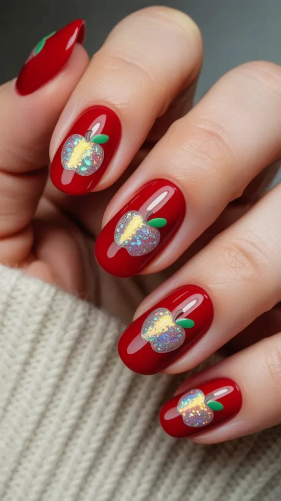 This design features a deep red or cherry base with a glossy finish, accented by holographic glitter resembling candy apples. Add tiny green leaf decals near the cuticle for a sweet touch. The sparkling holographic effect catches light beautifully, creating nails that look candy-coated and festive.