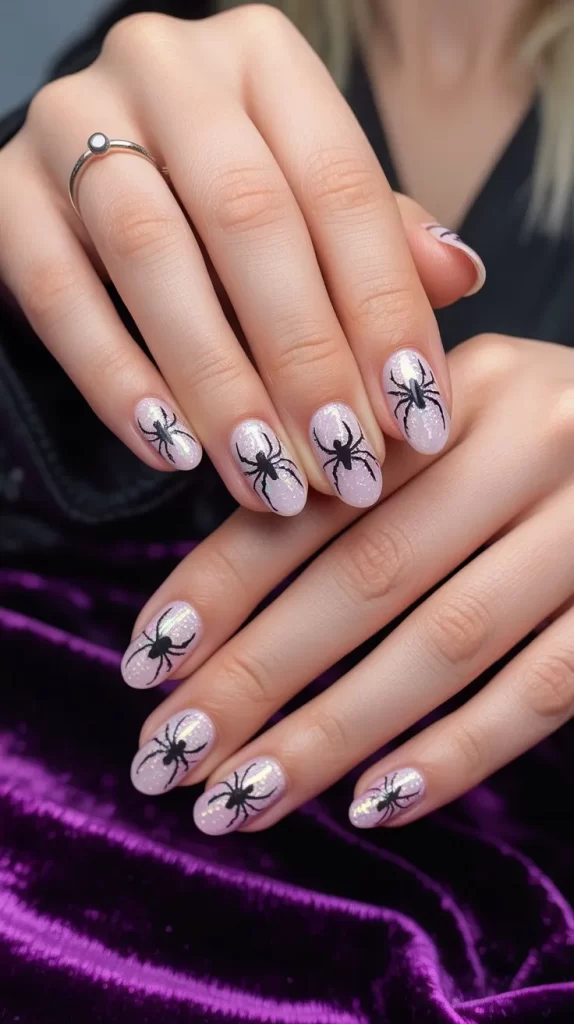 Give the spider theme a feminine twist by using a pale pink or baby rose base. Instead of creepy spiders, create delicate white or silver spider silhouettes on one or two accent nails. Add holographic or chunky pink glitter for a sparkling effect. The design is whimsical rather than scary, perfect for a girly Halloween vibe.