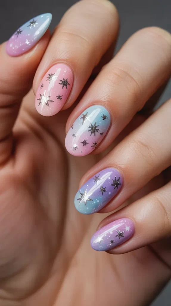 Inspired by the night sky, use soft pastel blues, pinks, and purples as your base. Blend colors to create a dreamy galaxy effect and add silver glitter or star-shaped confetti for a sparkling cosmic look. These nails give a mystical Halloween feel without being dark or scary.