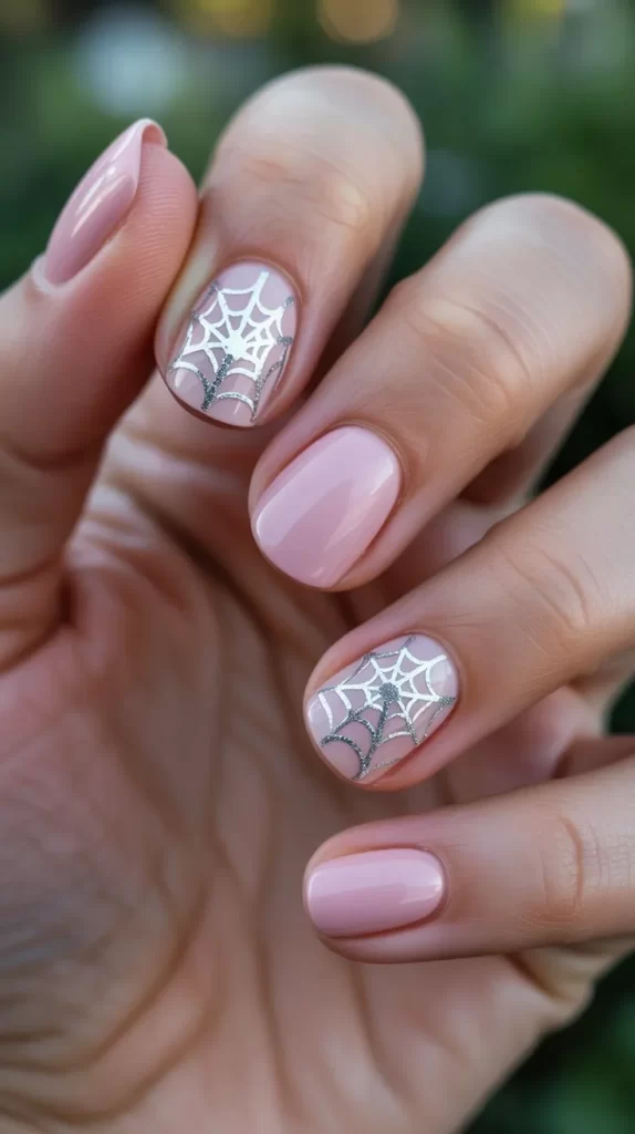 Use soft pink as the base color and create delicate white or silver spider webs on one or two accent nails. Add fine holographic glitter around the webs for a sparkling girly effect. The design is spooky-themed but soft enough for everyday wear.
