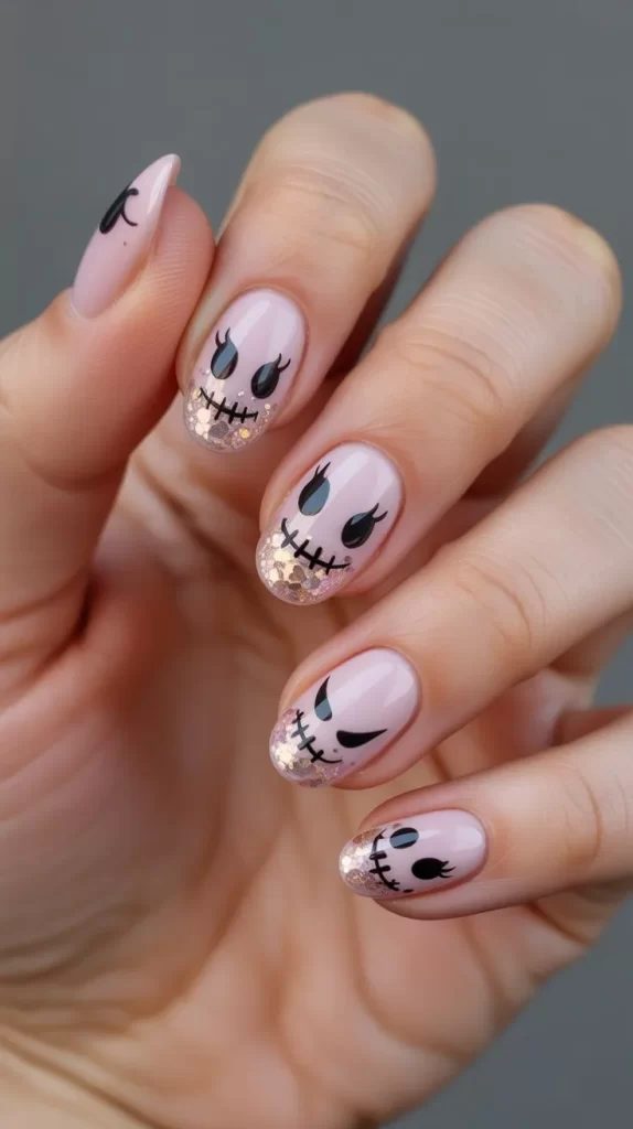 Use soft pink or peach as a base and paint tiny whimsical monster faces on accent nails. Highlight eyes or teeth with gold glitter to add sparkle and charm. The combination of cute monsters and glitter creates a playful Halloween manicure.