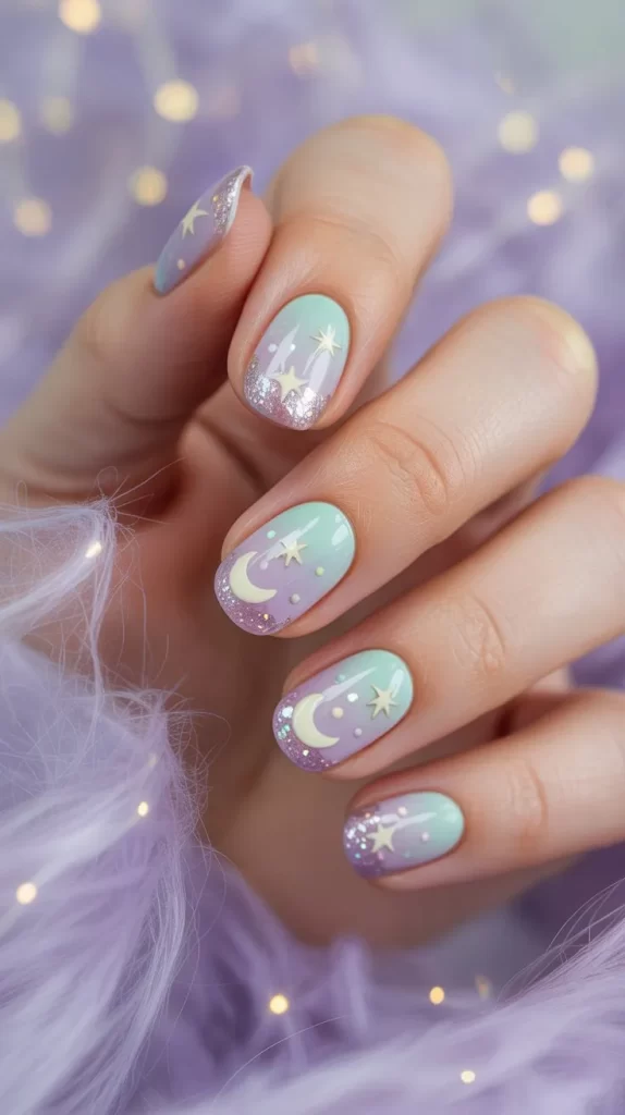 Forget dark greens and purples—these nails use pastel lilac and mint green for a witchy but girly look. Add holographic glitter on the tips and small crescent moons or star decals for extra magic. The combination of pastel colors and sparkle gives a mystical feel without looking too spooky.