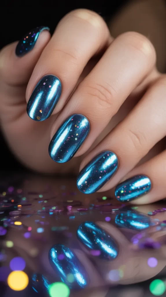 Metallic blue chrome nails are sleek, modern, and full of shine. Add a layer of fine glitter on top for extra sparkle that fits the holiday spirit.
