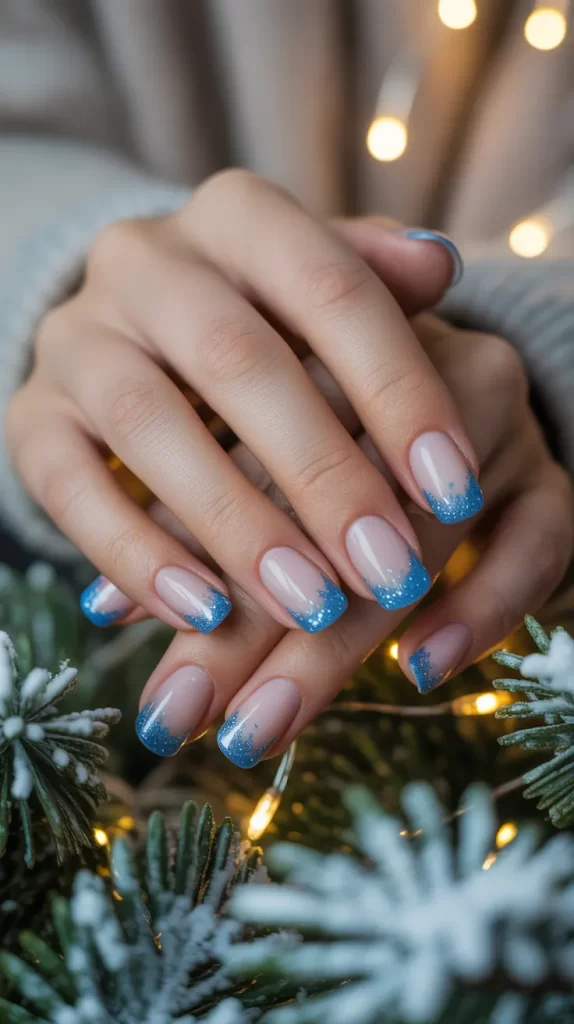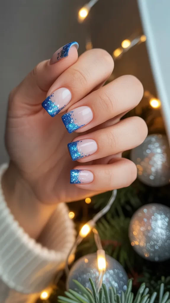 Combine a full blue glitter base with snowy white tips for a frosty French-inspired style. It’s playful and perfect for holiday fun.