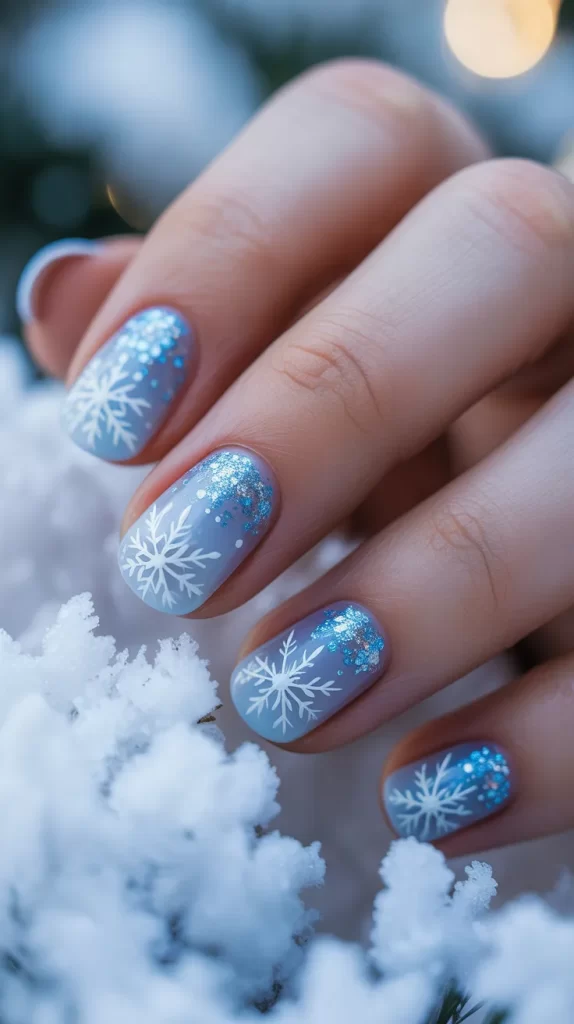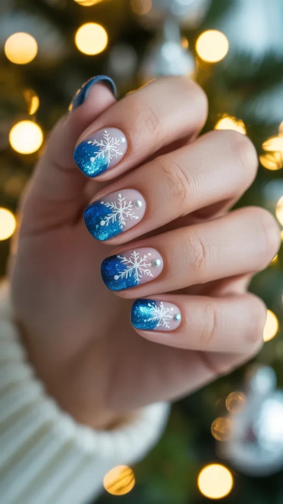 Finish your holiday nail journey with a gradient of blue glitter and delicate snowflake art on top. It’s a classic, magical design that captures the Christmas spirit perfectly.