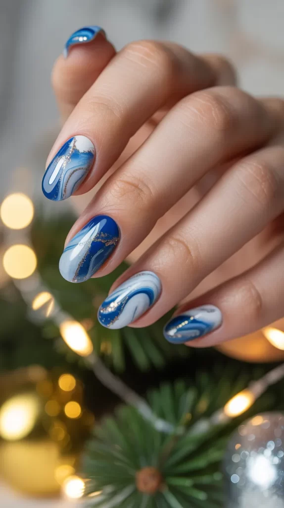 Marble designs are trending, and blue glitter adds a festive spin. Mix different shades of blue with touches of white to create a marble effect.