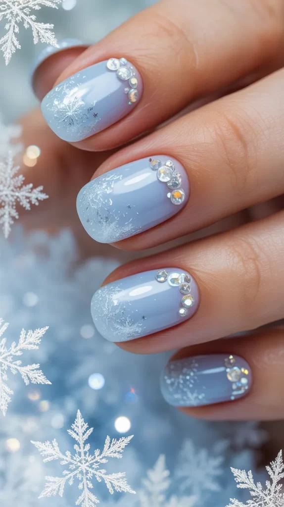 For a royal winter look, try light blue nails with silver glitter flakes and tiny crystal accents. It’s like turning your nails into frozen jewels.