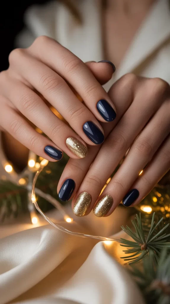 Combine navy blue polish with gold glitter for a classy contrast. Paint one or two accent nails fully in glitter for a touch of drama.