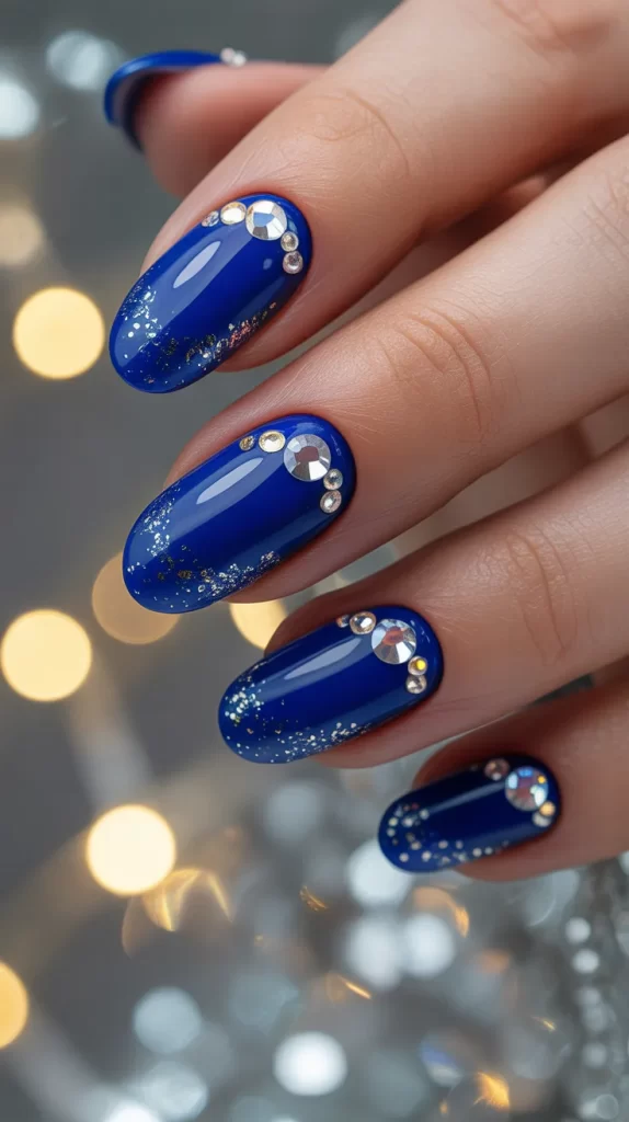 Turn your nails into statement pieces with royal blue polish and sparkling rhinestones. Add glitter polish under the crystals for extra shine.