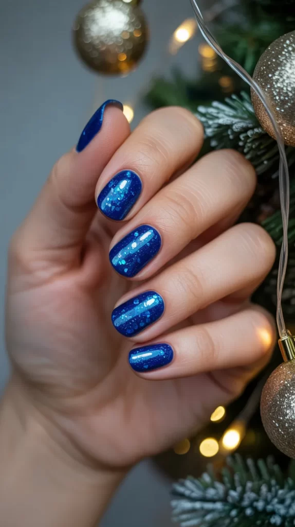 Sapphire blue nails with chunky glitter give a rich and luxurious feel. The gemstone-inspired color looks stunning under warm Christmas lighting.