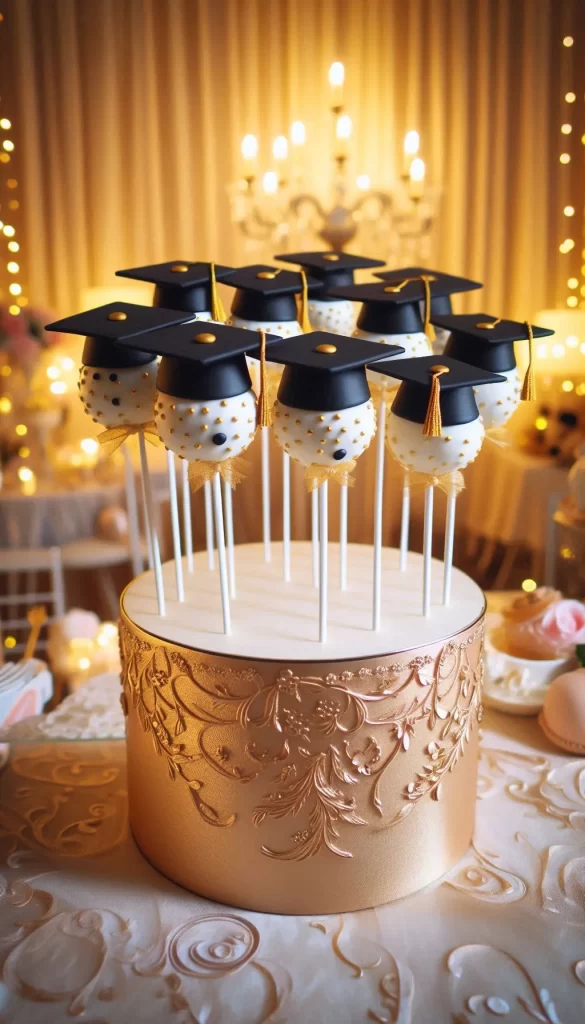 Cake pops shaped like graduation caps are fun and stylish, perfect for an elegant graduation party.