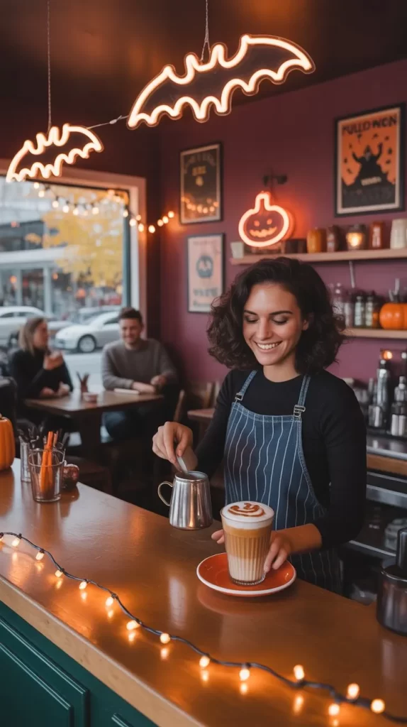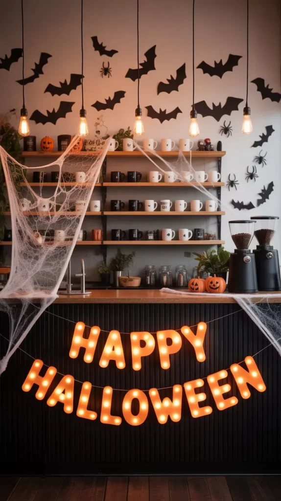 Lighting is one of the most powerful ways to set the mood. Replace regular lights with orange, purple, or green string lights. Add flameless LED candles for flickering effects, or use lanterns with spooky cutouts. For a modern touch, place small neon signs in Halloween shapes like bats or ghosts. This layered lighting turns your coffee bar into a cozy, glowing Halloween hub.
