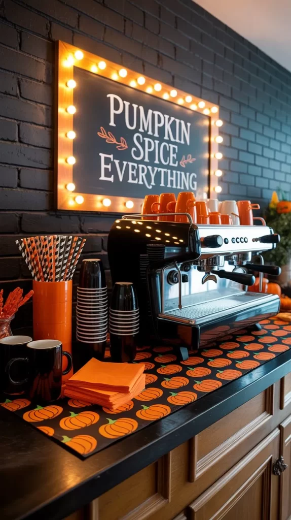 Sometimes the simplest hacks are the most effective. Stick to the traditional black and orange Halloween color palette for instant festive vibes. Use black mugs, napkins, and trays paired with orange straws, stirrers, and coasters. Add a striped black-and-orange table runner under your coffee machine to tie everything together. This theme is easy to achieve with items you might already own, making it budget-friendly but still bold and eye-catching.