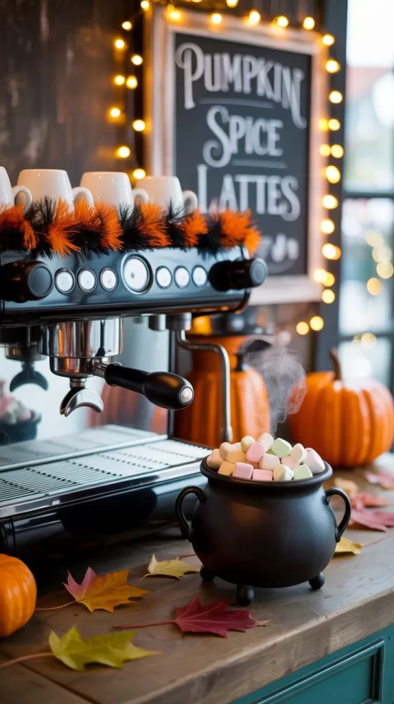 Pumpkins are the classic symbol of Halloween, and they instantly make your coffee bar feel festive. Start with a few real or faux pumpkins in different sizes and colors—orange, black, white, or even metallic gold. Use them as a backdrop on shelves, as accents on trays, or as fillers around your coffee machine. For drinks, add pumpkin-shaped mugs and pumpkin spice syrup. If you want extra coziness, wrap a string of warm orange fairy lights around your pumpkins for a magical glow. This hack creates a fall-inspired coffee corner that’s cheerful and welcoming.